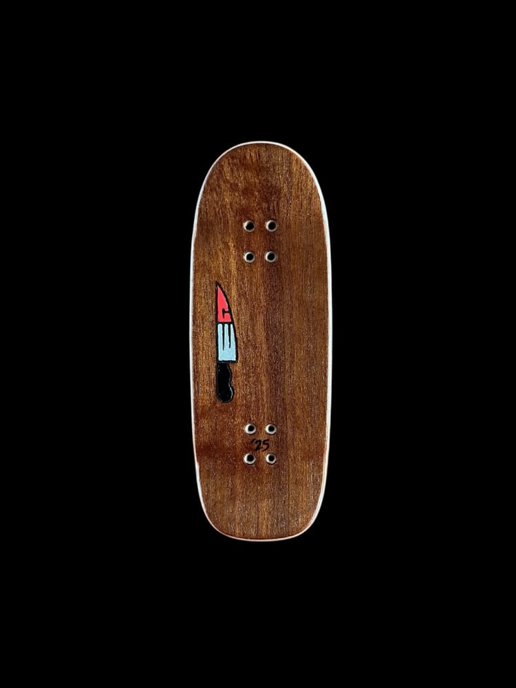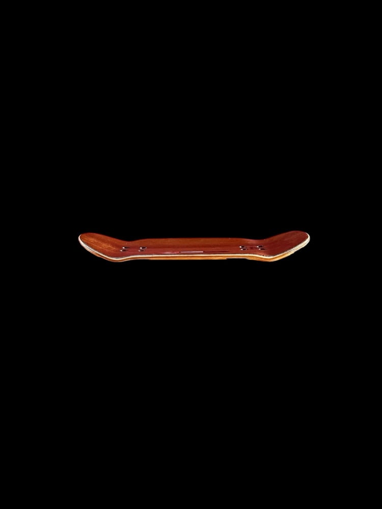 35mm x 97mm Tombstone “Michael Myers Split”. Fully hand cut split ply, with a hand burned and painted top ply. Collins Wood decks currently have a wheelbase of 59mm. Concave 1.5mm, and a kick degree of about 22.5 with an ever so slight raise in the nose. Each deck comes with foam tape, stickers, and good luck charm.